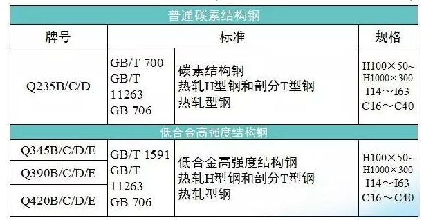 H型钢的产品其实不算很复杂,因为市面上常见的H型钢都是做钢结构用的。不过也有部分应用领域也比较特殊,比如海上石油平台、钻井架、高寒地区钢结构、轨道交通等。 常规钢结构用H型钢,国内牌号一般是Q235和Q345的B、C、D等级,北方寒冷地区会用到E等级,但极其少。日本牌号最常见的是SS400、SM490A/B、SN490A/B。欧标常见为S235、S355的JR、J0、J2等级。 我们以几张表来展示一下国内外常见H型钢的牌号以及某钢厂能生产的规格: