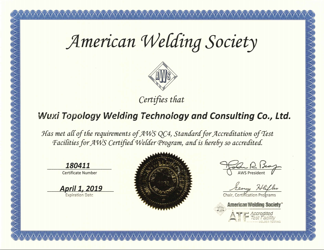 | 我司顺利通过美国焊接学会AWS专家评审成为国际授权ATF焊接考试机构 |